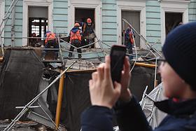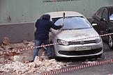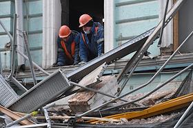Последствия обрушения строительных лесов на припаркованные автомобили в Георгиевском переулке напротив здания Государственной думы России. рабочие во время разбора обрушенных лесов.