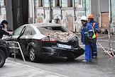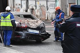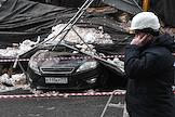 Последствия обрушения строительных лесов на припаркованные автомобили в Георгиевском переулке напротив здания Государственной думы России.