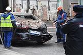 Последствия обрушения строительных лесов на припаркованные автомобили в Георгиевском переулке напротив здания Государственной думы (ГД) России. Жанровая фотография. Отражение последствий обрушения в окнах здания ГД России.