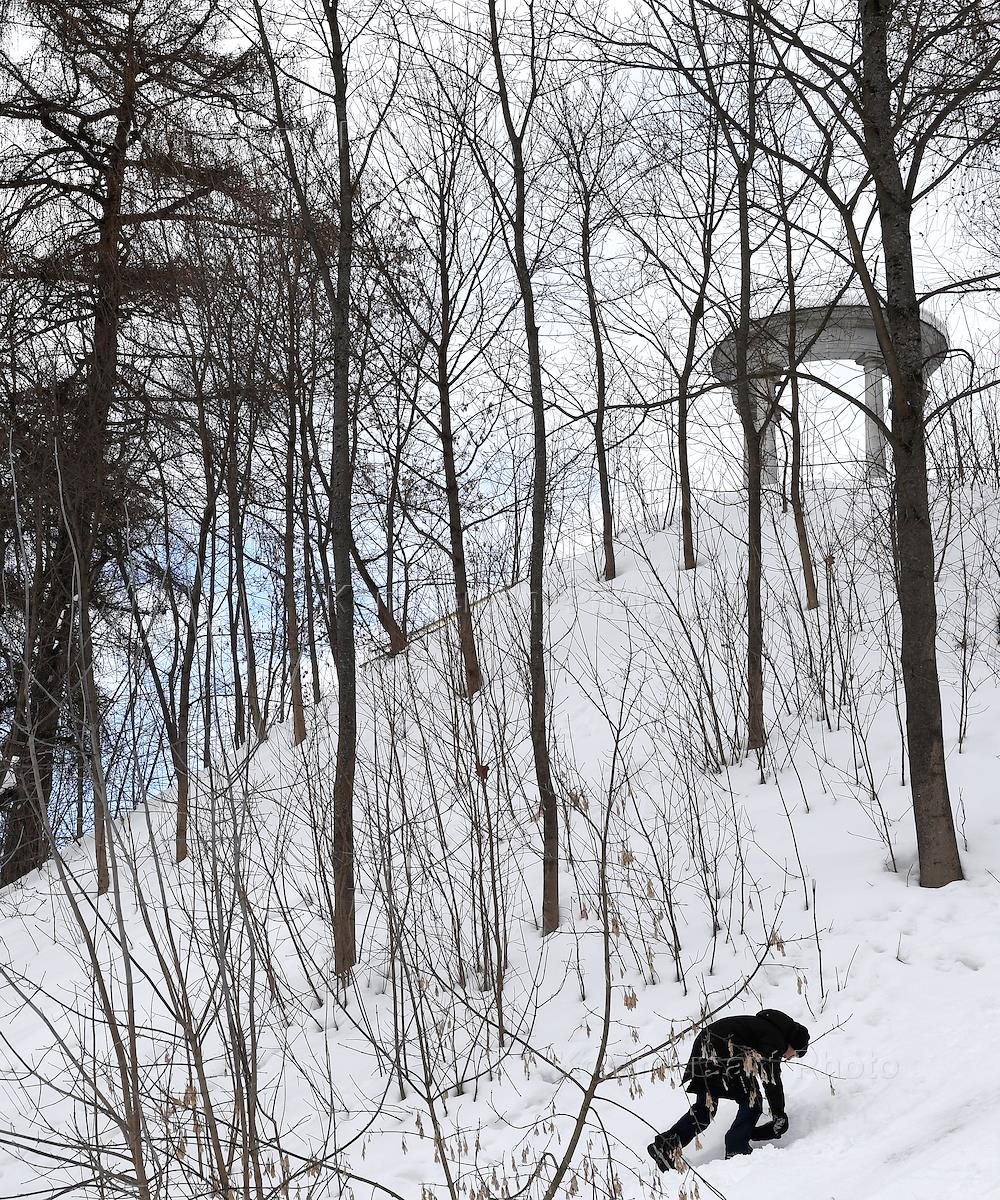 Genre photography. A boy climbs a snow-covered slope on the territory of the Arkhangelskoye palace and park ensemble.