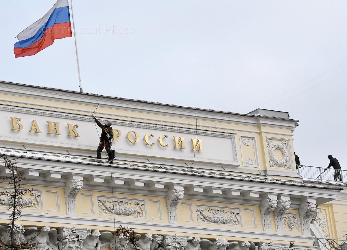 Виды Москвы. Улица Неглинная. Жанровые фотографии. Промышленные альпинисты счищают снег с крыши здания Центрального Банка России.