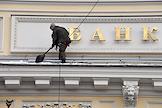 Виды Москвы. Улица Неглинная. Жанровые фотографии. Промышленный альпинист счищает снег с крыши здания Центрального Банка России.