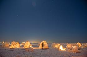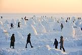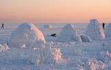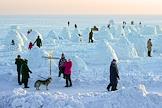 Ежегодный зимний фестиваль Иглу-2022 "Город эскимосов" на пляже "Бумеранг" на берегу Обского моря. Жанровая фотография. Строения из снежных блоков.