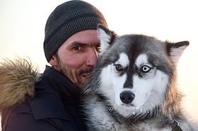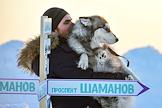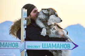 Жанровая фотография. Участник фестиваля Иглу-2022 "Город эскимосов" на льду Новосибирского водохранилища у пляжа "Бумеранг", с собакой породы хаски на руках у указателя с надписью "Проспект Шаманов".