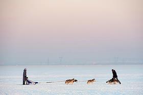 Участники фестиваля Иглу-2022 "Город эскимосов" на льду Новосибирского водохранилища у пляжа "Бумеранг" катаются на упряжке с собаками.