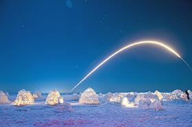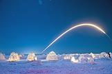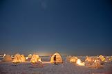 Жанровая фотография. Дома изо льда, построенные участниками фестиваля Иглу-2022 "Город эскимосов" на льду Новосибирского водохранилища у пляжа "Бумеранг" на фоне светового следа от ракетницы.