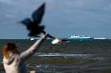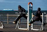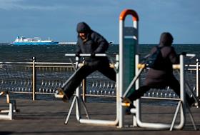 Плавучее хранилище сжиженного природного газа (СПГ), оснащенное судовой регазификационной установкой, "Маршал Василевский" в море недалеко города. Жанровая фотография. Люди занимаются на тренажерах на набережной у моря.