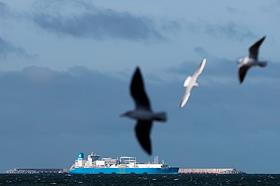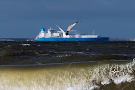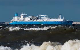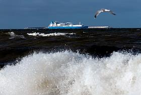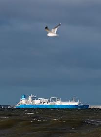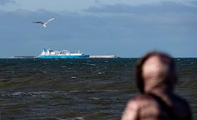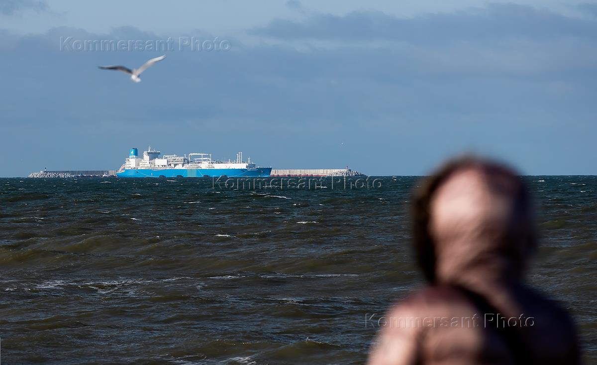 Плавучее хранилище сжиженного природного газа (СПГ), оснащенное судовой регазификационной установкой, "Маршал Василевский" в море у города.