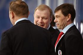 XXIV зимние Олимпийские игры в Пекине. 1/4 финала по хоккею с шайбой на стадионе "Укэсун Спорт-центр". Матч между сборными командами России и Дании. Главный тренер сборной России Алексей Жамнов (в центре) и тренер сборной России Алексей Кудашов (справа) во время матча.