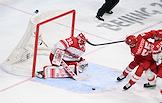 XXIV зимние Олимпийские игры в Пекине. 1/4 финала по хоккею с шайбой на стадионе "Укэсун Спорт-центр". Матч между сборными командами России и Дании. Вратарь сборной России Тимур Билялов (слева) во время матча.
