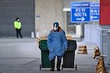 XXIV зимние Олимпийские игры в Пекине. 1/4 финала по хоккею с шайбой на стадионе "Укэсун Спорт-центр". Матч между сборными командами России и Дании. Жанровая фотография. Сотрудник сервисной службы с мусорными баками у стадиона.