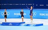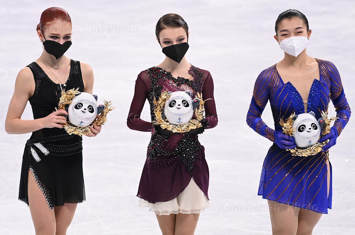 XXIV Winter Olympic Games in Beijing. Figure skating competitions in the Capital Sports Palace. Flower ceremony of the winners of the competition. From left to right: Russian athletes Alexandra Trusova (silver), Anna Shcherbakova (gold) and Japanese athlete Kaori Sakamoto (bronze) during the ceremony.