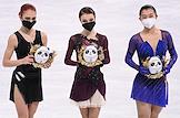 XXIV Winter Olympic Games in Beijing. Figure skating. Women. Free program in the Capital Palace of Sports. From left to right: Russian figure skaters Alexandra Trusova, Anna Shcherbakova and Japanese figure skater Kaori Sakamoto during the flower ceremony.