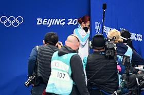 XXIV Winter Olympic Games in Beijing. Figure skating competitions in the Capital Sports Palace. Women. Free program. From left to right: figure skating coach Eteri Tutberidze, Russian athlete Kamila Valieva and coach, choreographer Daniil Gleikhengauz after the performance.