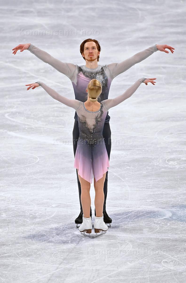 XXIV зимние Олимпийские игры в Пекине. Соревнования по фигурному катанию в Столичном дворце спорта. Спортивные пары. Произвольная программа. Российские фигуристы Александра Бойкова и Дмитрий Козловский во время соревнований.