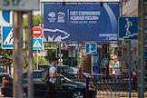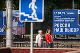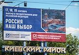 Предвыборная агитация на территории самопровозглашенной Донецкой Народной Республики (ДНР) в Донецке. Агитационный плакат "Россия наш выбор" о выборах депутатов Государственной думы России 17-19 сентября 2021 года и о голосовании на избирательных участках в Ростовской области России.