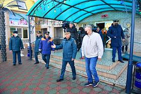 Размещение граждан, эвакуированных из-за обострения ситуации в самопровозглашенных Донецкой и Луганской народных республиках (ДНР и ЛНР), в пансионат "Звезда" Ростовской области. Временно исполняющий обязанности министра России по делам гражданской обороны, чрезвычайным ситуациям и ликвидации последствий стихийных бедствий Александр Чуприян (в центре) у пансионата.