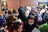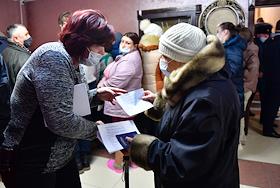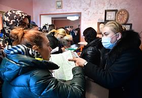 Размещение граждан, эвакуированных из-за обострения ситуации в самопровозглашенных Донецкой и Луганской народных республиках (ДНР и ЛНР), в пансионат "Звезда" Ростовской области. Женщины во время оформления документов на размещение.