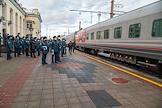 Встреча первого поезда с беженцами из Донецкой народной республики (ДНР) на железнодорожном вокзале "Воронеж-1". Сотрудники МЧС на перроне.