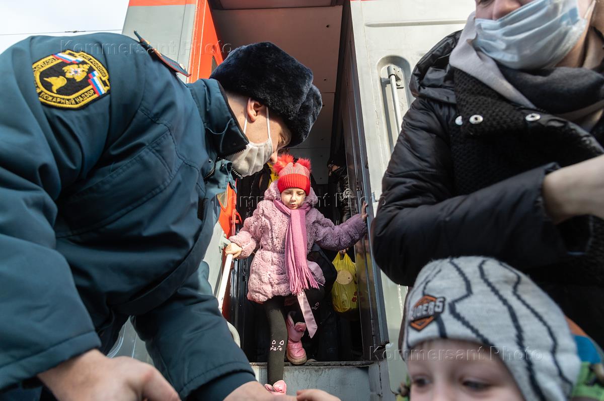 Meeting of the first train with refugees from the Donetsk People's Republic (DPR) at the Voronezh-1 railway station.