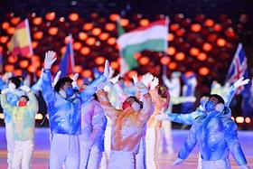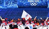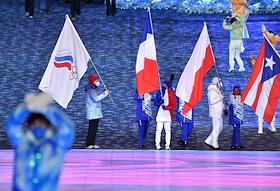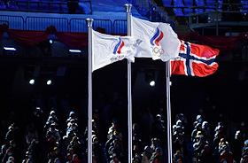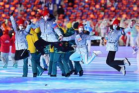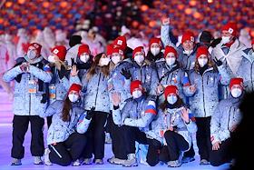 XXIV зимние Олимпийские игры в Пекине. Церемония закрытия на Национальном стадионе "Птичье гнездо". Члены сборной команды России во время церемонии.