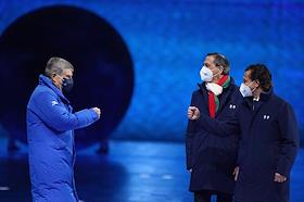 XXIV зимние Олимпийские игры в Пекине. Церемония закрытия на Национальном стадионе "Птичье гнездо". Слева направо: президент Международного олимпийского комитета (МОК) Томас Бах, мэр Милана Джузеппе Сале и мэр Кортина-д'Ампеццо Джанпьетро Гедине во время церемонии.