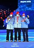 XXIV зимние Олимпийские игры в Пекине. Церемония награждения победителей в соревнованиях по лыжным гонкам на 30 км среди мужчин на Национальном стадионе "Птичье гнездо". Слева направо: российские спортсмены Иван Якимушкин, Александр Большунов и норвежский спортсмен Симен Хегстад Крюгер во время церемонии.