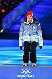 XXIV зимние Олимпийские игры в Пекине. Церемония награждения победителей в соревнованиях по лыжным гонкам на 30 км среди женщин на Национальном стадионе "Птичье гнездо". Американская спортсменка Джессика Диггинс, занявшая второе место, во время церемонии.