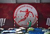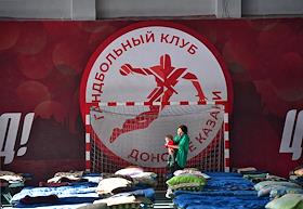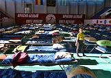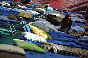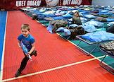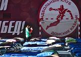Ситуация в Ростовской области в период обострения ситуации в самопровозглашенных Донецкой Народной Республике (ДНР) и Луганской Народной республике (ЛНР). Прибытие эвакуированных граждан ДНР в Ростовскую область. Эвакуированные граждане Донецкой народной республики (ДНР) в пункте временного размещения в спортивной школе № 13. Спальные места для беженцев в спортивном зале школы.