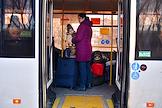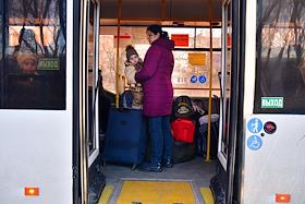 Ситуация в Ростовской области в период обострения ситуации в самопровозглашенных Донецкой Народной Республике (ДНР) и Луганской Народной республике (ЛНР). Прибытие эвакуированных граждан ДНР в Ростовскую область. Эвакуированные граждане Донецкой Народной Республики (ДНР) на железнодорожной станции "Таганрог-1" в автобусе перед отправлением к месту размещения.