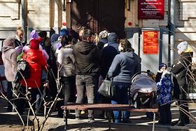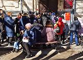 Ситуация в Ростовской области в период обострения ситуации в самопровозглашенных Донецкой Народной Республике (ДНР) и Луганской Народной республике (ЛНР). Прибытие эвакуированных граждан ДНР в Ростовскую область. Эвакуированные граждане ДНР у здания Управления социальной защиты города Таганрога.