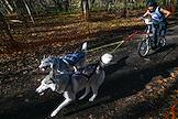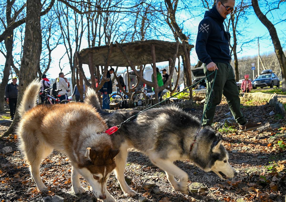 Открытые соревнования по ездовому спорту на собаках (бесснежные дисциплины) "Южный крест-2021" во время нерабочих дней в связи с пандемией COVID-19 на территории Мамайского леса. Жанровая фотография. Участники во время соревнований.