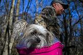 Открытые соревнования по ездовому спорту на собаках (бесснежные дисциплины) "Южный крест-2021" во время нерабочих дней в связи с пандемией COVID-19 на территории Мамайского леса. Жанровая фотография. Участник с собакой в багажнике перед началом соревнований.