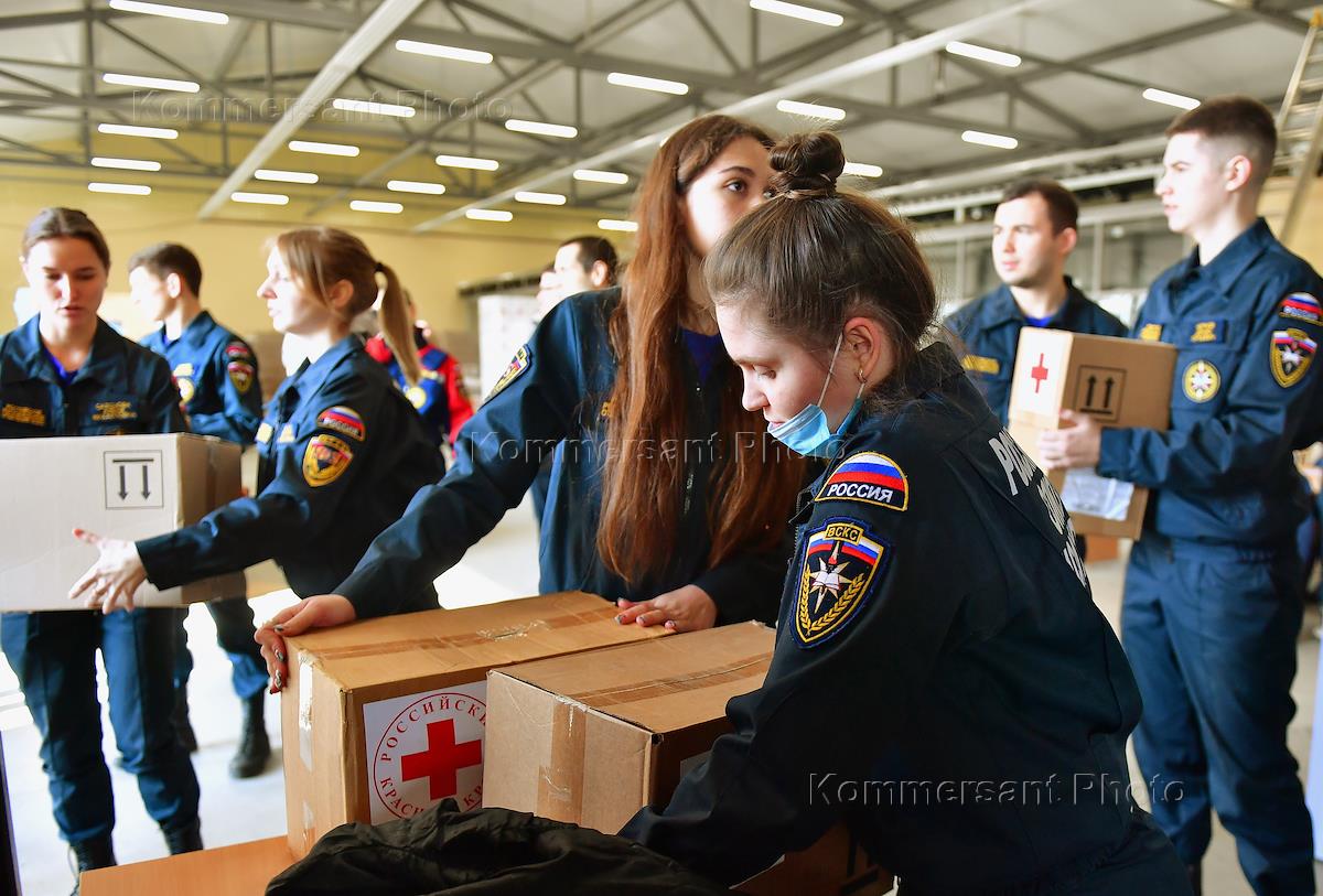 Ситуация в Ростовской области в период обострения ситуации в Донецкой Народной Республике (ДНР) и Луганской Народной республике (ЛНР). Члены Российского союза спасателей в центре сбора гуманитарной помощи для эвакуированных граждан ДНР и ЛНР.