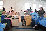 Ситуация в Ростовской области в период обострения ситуации в Донецкой Народной Республике (ДНР) и Луганской Народной республике (ЛНР). Члены Российского союза спасателей в центре сбора гуманитарной помощи для эвакуированных граждан ДНР и ЛНР. Эвакуированные жители Донбасса в пункте временного размещения на базе спорткомплекса хутора Ленина.