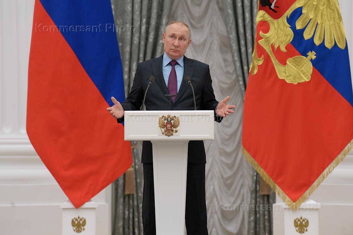 Президент России Владимир Путин во время пресс-конференции. Президент России Владимир Путин ответил на ряд актуальных вопросов представителей средств массовой информации, касающихся, в частности, признания Донецкой и Луганской народных республик.