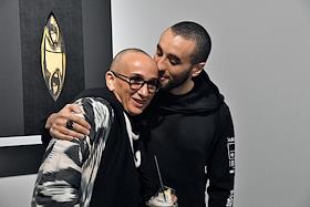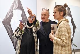 Презентация лимитированного альбома тиражной графики Айдан Салаховой "Секретный орнамент" в галерее "Триумф". Художник Айдан Салахова (слева) и совладелец галереи "Триумф" Емельян Захаров (в центре) на презентации.