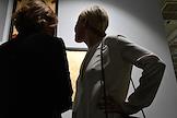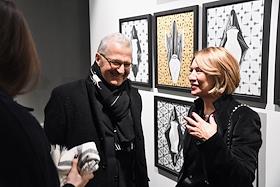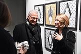 Презентация лимитированного альбома тиражной графики Айдан Салаховой "Секретный орнамент" в галерее "Триумф". Коллекционер и издатель Пьер-Кристиан Броше (слева) и продюсер Валерия Роднянская (справа) на презентации.