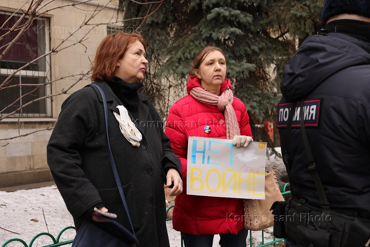 Ситуация у посольства Украины в России в Леонтьевском переулке. Одиночные антивоенные пикету у здания посольства. Задержание участников пикетов.