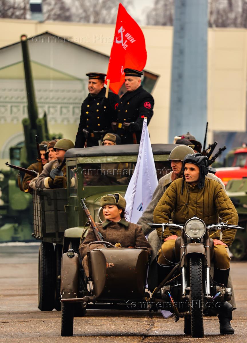 Празднование Дня Защитника Отечества в Музее техники коллекционера Вадима Задорожного "Парад военной техники". Участники празднования в форме военных лет во время парада.