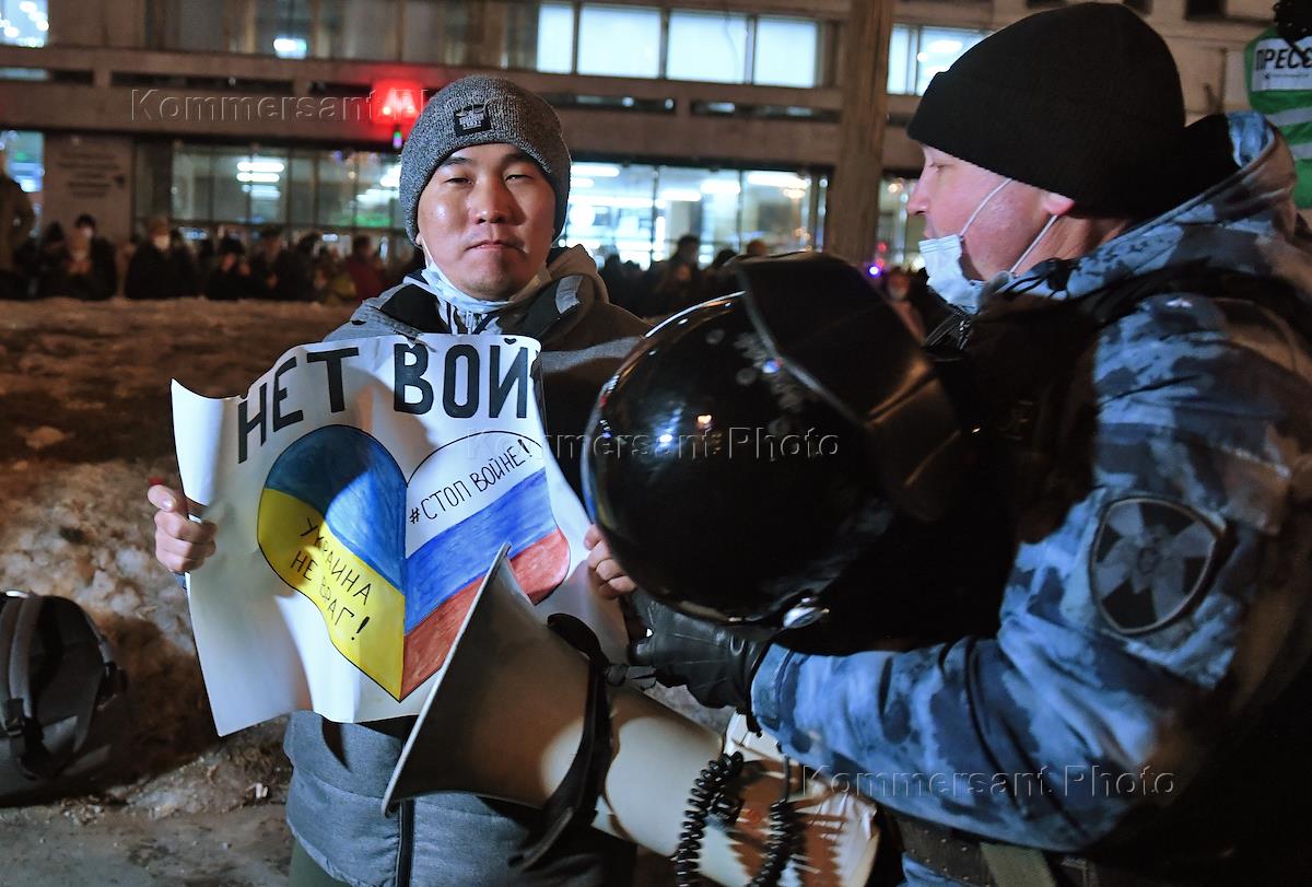 Несогласованная акция против специальной военной операции на Украине на Пушкинской площади. Утром 24 февраля президент России Владимир Путин во время срочного обращения в прямом эфире объявил о начале специальной военной операции на Донбассе. Донецкая и Луганская Народные Республики на фоне обострения ситуации объявили 18 февраля об организации выезда населения в Россию, 19 февраля - о всеобщей мобилизации граждан. Участники во время акции. акции.