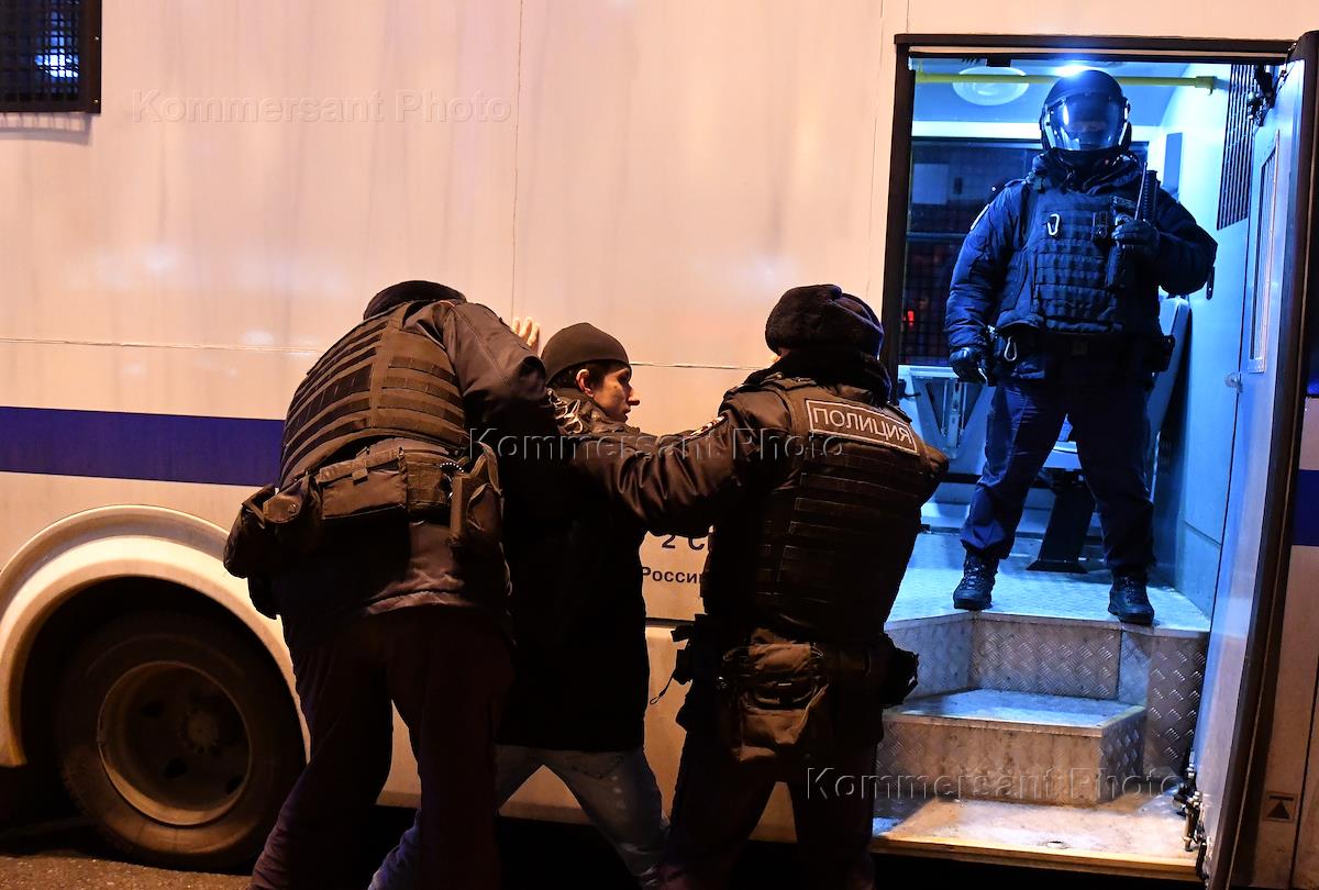 Несогласованная акция против специальной военной операции на Украине на Пушкинской площади. Утром 24 февраля президент России Владимир Путин во время срочного обращения в прямом эфире объявил о начале специальной военной операции на Донбассе. Донецкая и Луганская Народные Республики на фоне обострения ситуации объявили 18 февраля об организации выезда населения в Россию, 19 февраля - о всеобщей мобилизации граждан. Сотрудники полиции во время задержания участников акции.