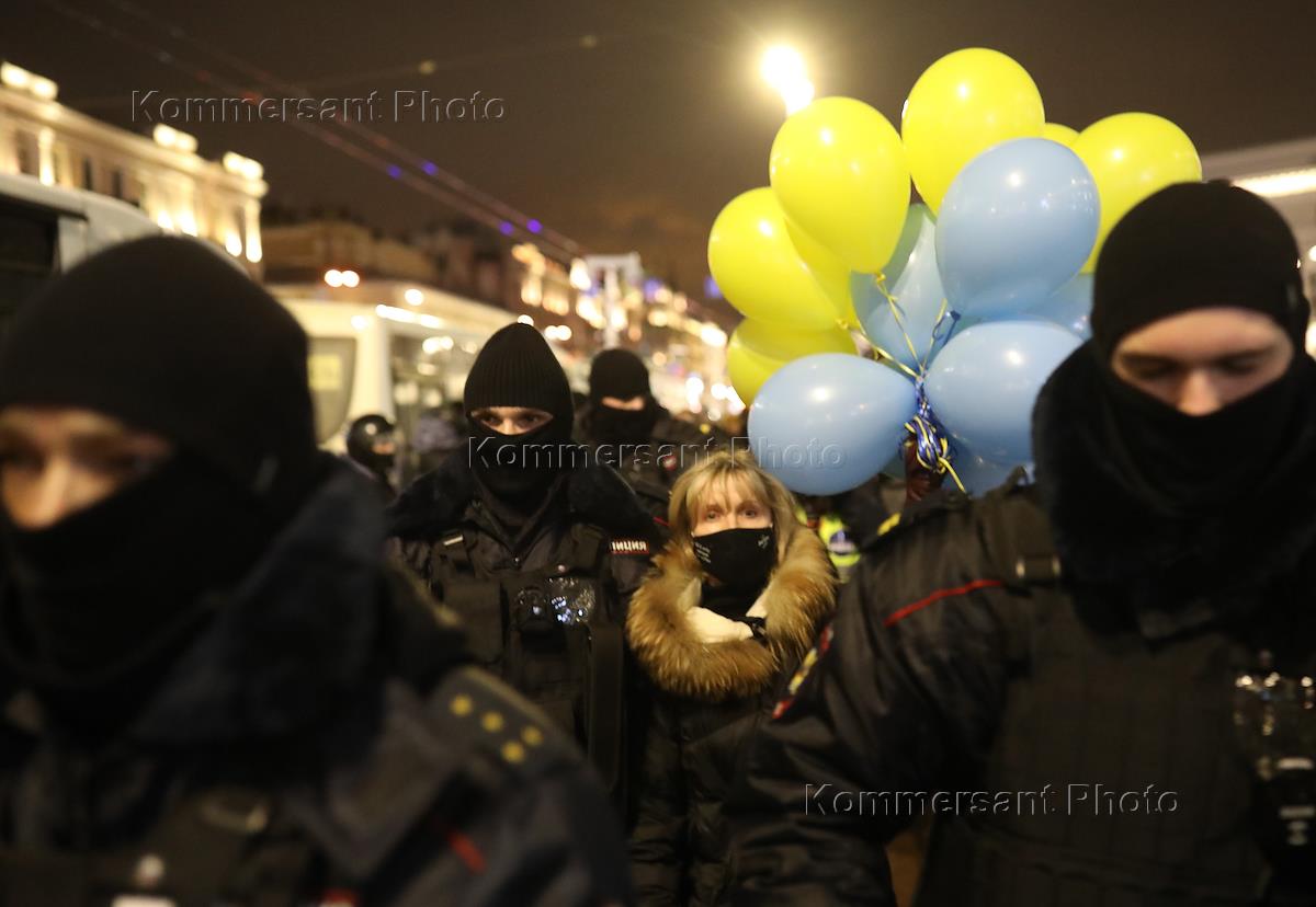 Action "No to war!" youth democratic movement "Vremya" on Nevsky Prospekt near Gostiny Dvor. Police officers during the detention of protesters.