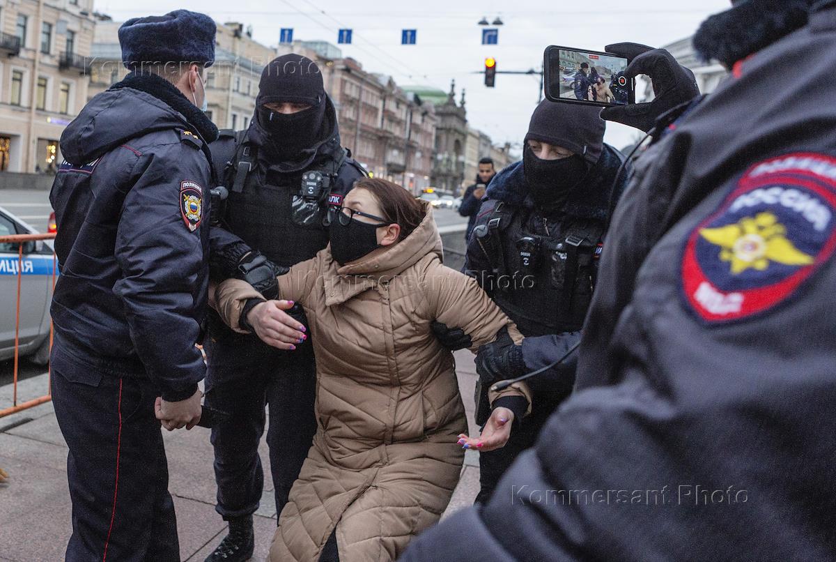 Несогласованная акция против специальной военной операции на Украине на Невском проспекте у Гостиного двора. Утром 24 февраля президент России Владимир Путин во время срочного обращения в прямом эфире объявил о начале специальной военной операции на Донбассе. Донецкая и Луганская Народные Республики на фоне обострения ситуации объявили 18 февраля об организации выезда населения в Россию, 19 февраля - о всеобщей мобилизации граждан. Задержанные участники акции.
