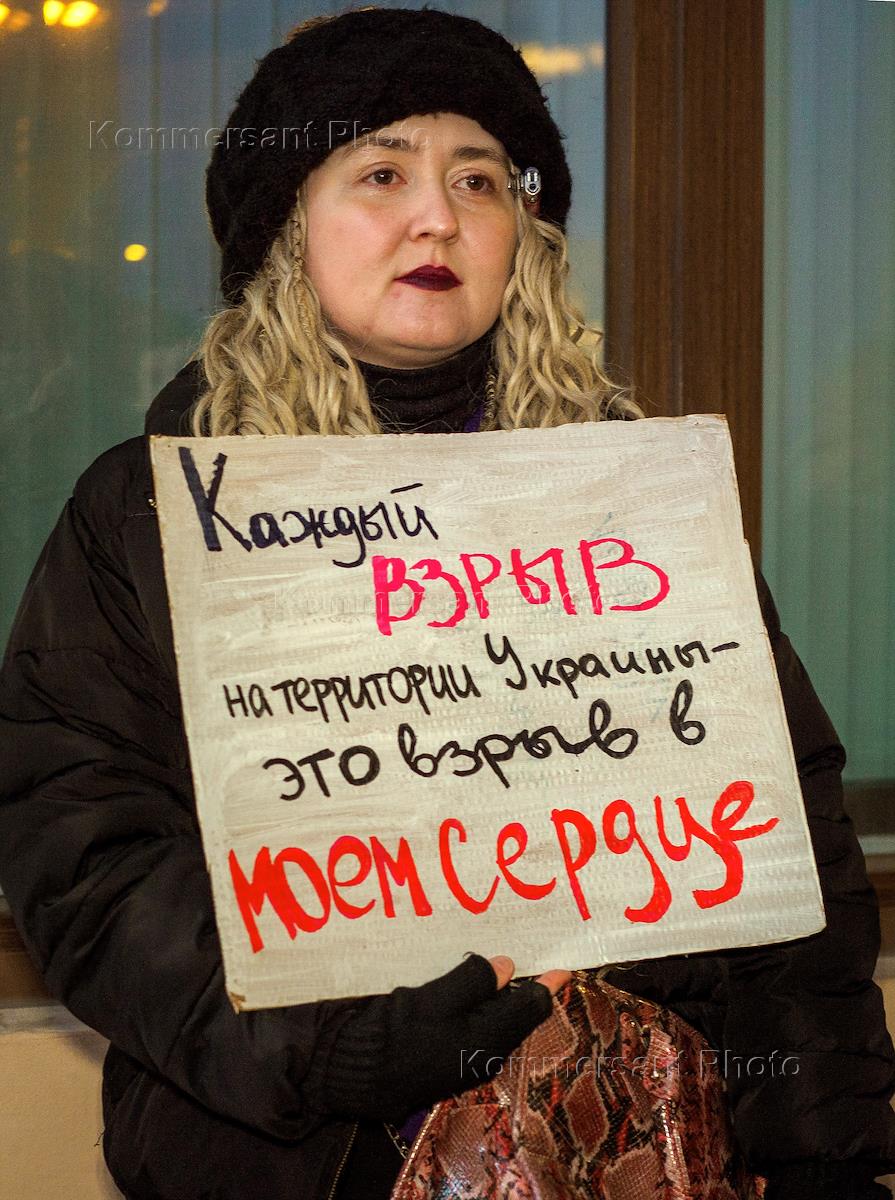 Несогласованная акция против специальной военной операции на Украине на Невском проспекте у Гостиного двора. Утром 24 февраля президент России Владимир Путин во время срочного обращения в прямом эфире объявил о начале специальной военной операции на Донбассе. Донецкая и Луганская Народные Республики на фоне обострения ситуации объявили 18 февраля об организации выезда населения в Россию, 19 февраля - о всеобщей мобилизации граждан. Участница с плакатом "Да! Любовь!" во время акции.