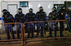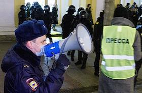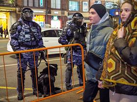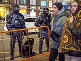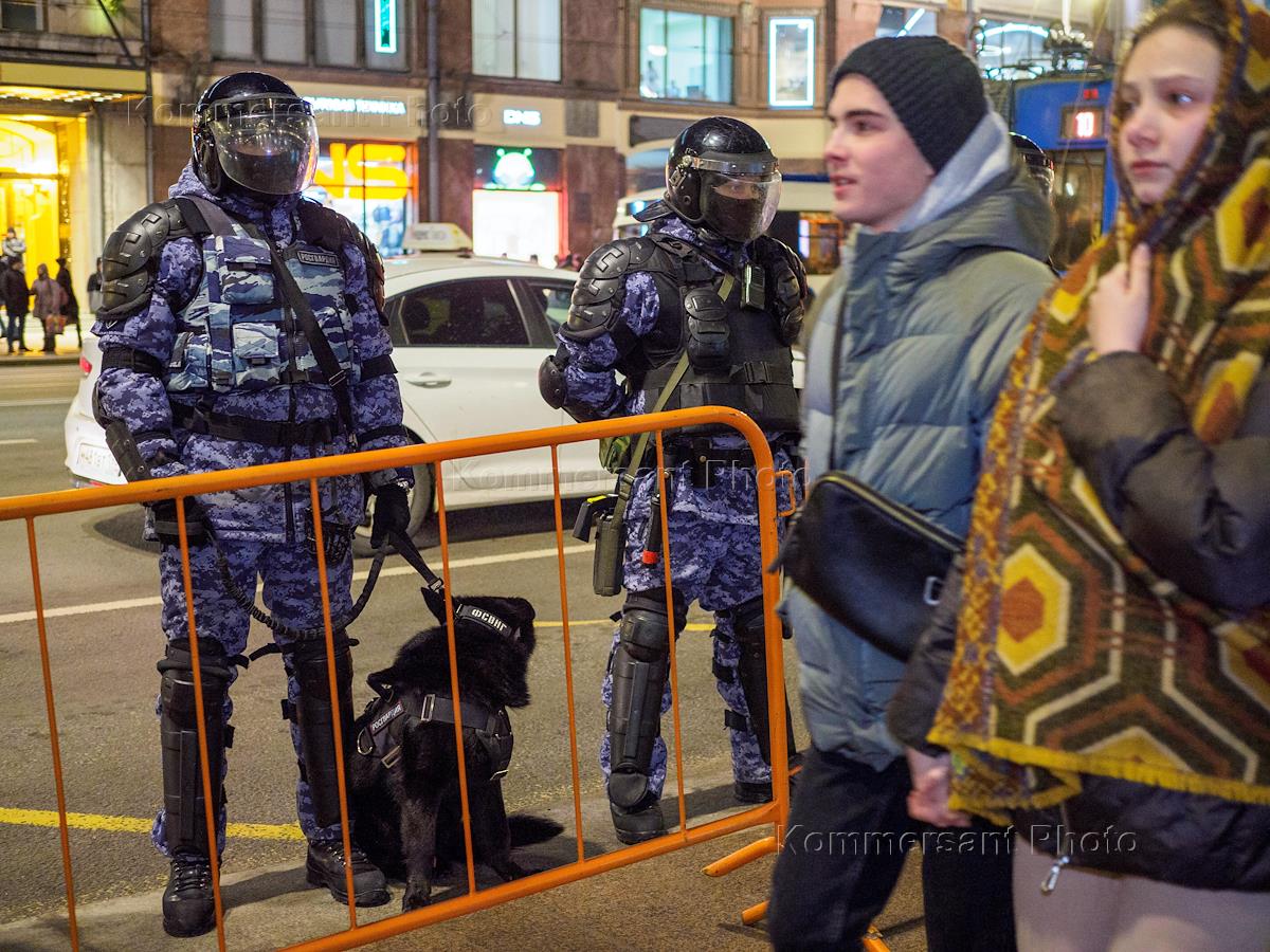 Несогласованная акция против специальной военной операции на Украине на Невском проспекте у Гостиного двора. Утром 24 февраля президент России Владимир Путин во время срочного обращения в прямом эфире объявил о начале специальной военной операции на Донбассе. Донецкая и Луганская Народные Республики на фоне обострения ситуации объявили 18 февраля об организации выезда населения в Россию, 19 февраля - о всеобщей мобилизации граждан. Сотрудники полиции во время патрулирования на месте проведения акции.