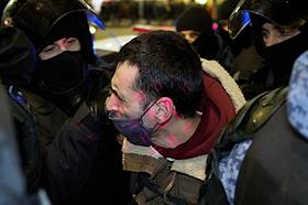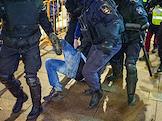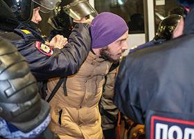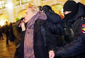 Несогласованная акция против специальной военной операции на Украине на Невском проспекте у Гостиного двора. Утром 24 февраля президент России Владимир Путин во время срочного обращения в прямом эфире объявил о начале специальной военной операции на Донбассе. Донецкая и Луганская Народные Республики на фоне обострения ситуации объявили 18 февраля об организации выезда населения в Россию, 19 февраля - о всеобщей мобилизации граждан. Сотрудники полиции во время задержания участников акции.