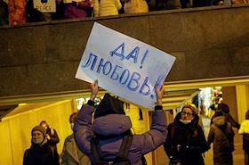 Несогласованная акция против специальной военной операции на Украине на Невском проспекте у Гостиного двора. Утром 24 февраля президент России Владимир Путин во время срочного обращения в прямом эфире объявил о начале специальной военной операции на Донбассе. Донецкая и Луганская Народные Республики на фоне обострения ситуации объявили 18 февраля об организации выезда населения в Россию, 19 февраля - о всеобщей мобилизации граждан. Участница с плакатом "Да! Любовь!" во время акции.