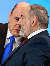 Рабочая поездка председателя правительства России Михаила Мишустина в Казахстан. Заседание Евразийского межправительственного совета (ЕМПС) в расширенном составе. Председатель правительства России Михаил Мишустин (слева) и премьер-министр Армении Никол Пашинян (справа) перед началом заседания.