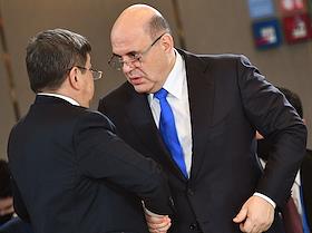 Рабочая поездка председателя правительства России Михаила Мишустина в Казахстан. Заседание Евразийского межправительственного совета (ЕМПС) в расширенном составе. Председатель правительства России Михаил Мишустин (слева) и его его заместитель Алексей Оверчук (справа) перед началом заседания.